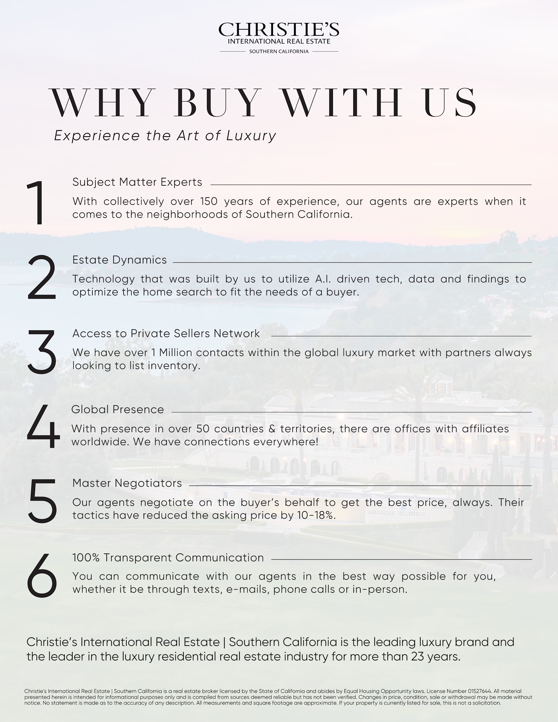 Christie’s International Real Estate | Southern California is the leading luxury brand and the leader in the luxury residential real estate industry for more than 23 years. There are many reasons why you should choose us to assist you in finding your new home, but see some of our top qualities below: