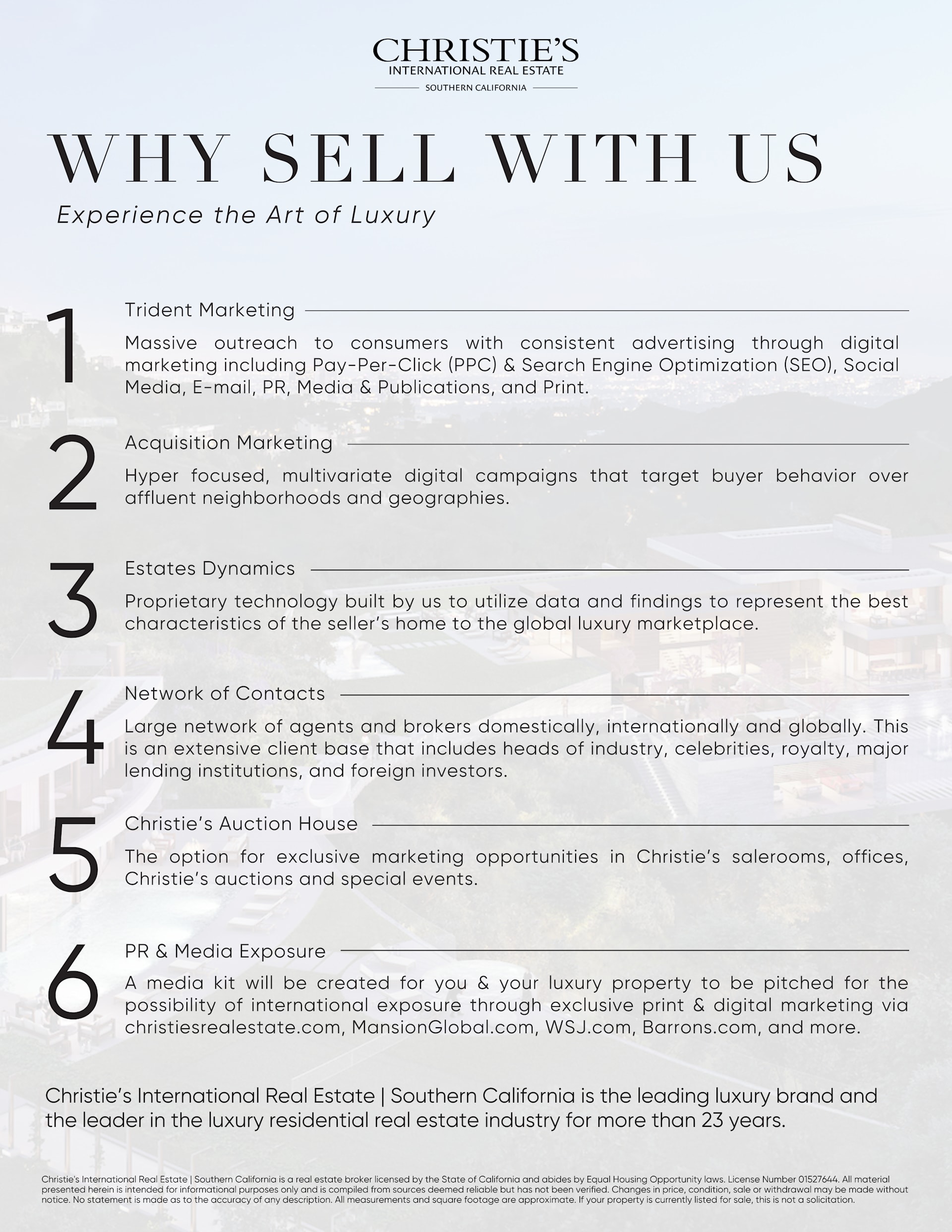 Christie’s International Real Estate | Southern California is the leading luxury brand and the leader in the luxury residential real estate industry for more than 23 years. There are many reasons why you should choose us to assist you in selling your home, but see some of our top qualities below: