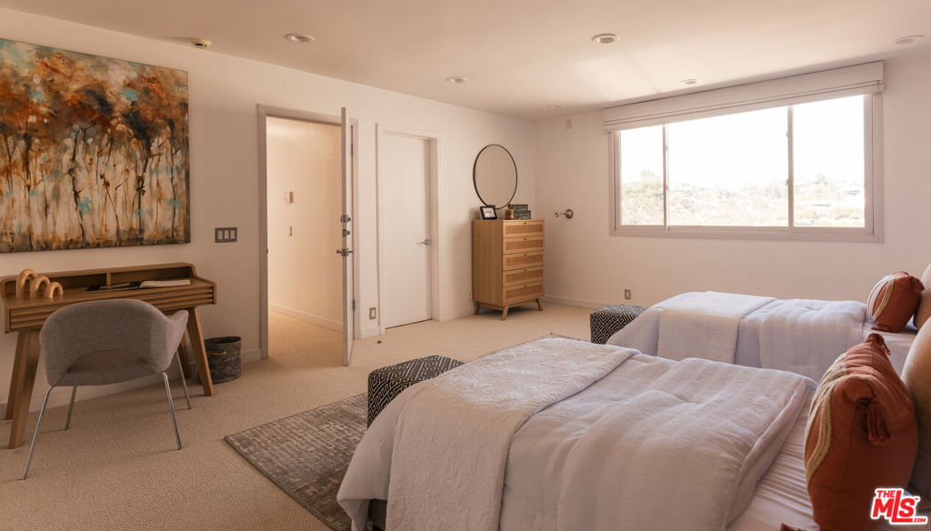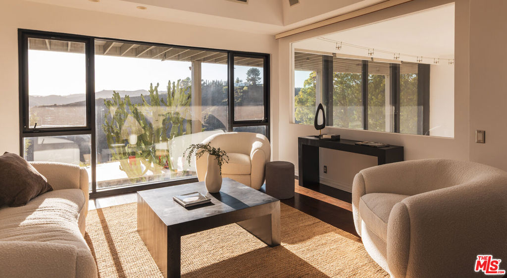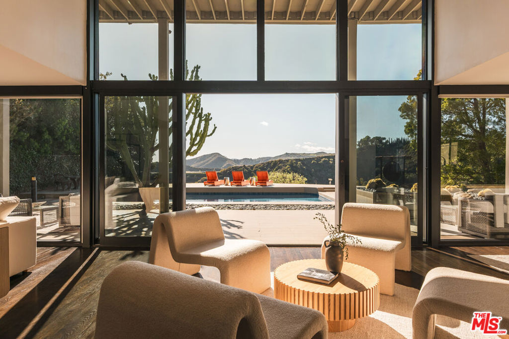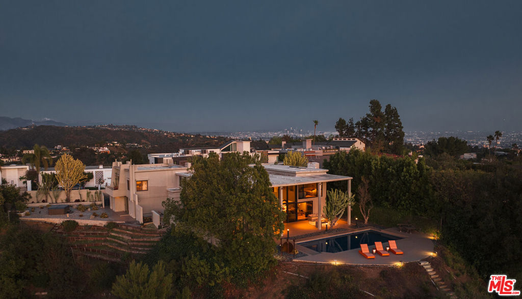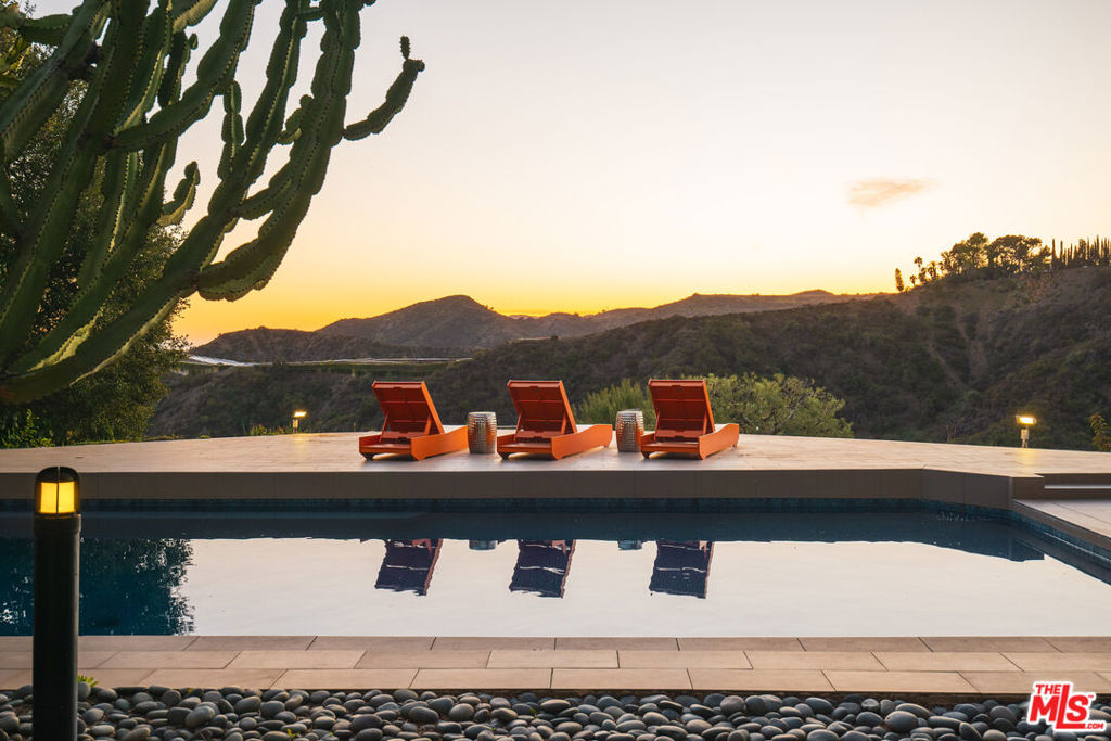 Welcome to an unparalleled private retreat, seamlessly blending mid-century charm with modern sophistication. Behind a large gated motor court, this desert modern sanctuary sits deep off the street, on more than 1.1 acres, and is a rare offering of seclusion, privacy, and space on one of the most coveted view-streets in Bel-Air. Originally built in the 1960s, this architectural masterpiece has been thoughtfully reimagined by renowned architect Patrick J. Killen. The heart of the home is its soaring open-concept living space, where 18-foot floor-to-ceiling windows and glass sliders dissolve the boundary between indoors and out. Set on one of the largest flat pads on Stradella, this estate is designed for both grand entertaining and intimate relaxation. The rare mosaic tile pool, expansive sundeck, and sleek patio space create an idyllic backdrop for hosting. A built-in outdoor barbecue extends from the kitchen and leads to the north yard's jacuzzi and serene zen garden. The interior flows seamlessly using solid wood and porcelain tile floors. The Thermador and Wolf appointed chef's kitchen connects light, bright, and expansive living and dining spaces. Off the kitchen, a tall and bright staircase takes you to the media/game room with built-in bar, full bath with steam shower, and sweeping views of the city, canyon, and reservoir. The bottom floor also provides access to a deluxe bedroom suite with its own exterior access. The generous 2-car garage flows seamlessly from the kitchen and offers EV charging. Upstairs, the southern wing nestles the serene and perfectly appointed primary suite with breathtaking views. It boasts a separate living space, vanity area, walk-in closet, and large travertine bathroom. Situated off the primary, a welcoming office space also faces the picturesque view. The private northern wing holds two bedrooms each with stunning views and accompanying bathrooms. More than just a home, this estate is a sanctuary where luxury, nature, and privacy converge. Experience the rare, pure oasis that is Stradella's most coveted retreat - a place where modern elegance meets timeless tranquility.