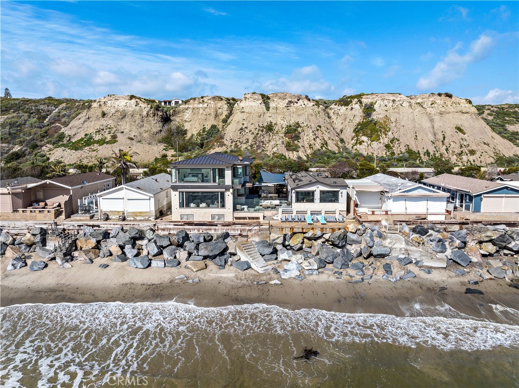 Set on the sand in the exclusive Capistrano Shores community, this rare double homesite offers ultimate California beachfront living, with panoramic whitewater, sunset, coastline, and beach views that stretch from the San Clemente Pier through the Headlands of Dana Point. Contemporary and highly upgraded, the main home provides four bedroom, four bathrooms, and the second home provides three bedrooms, 2 bathrooms. Lush outdoor space is equipped with security doors, tons of seating, a built-in BBQ and bar area, a storage area for all your beach accessories, and a partial glass enclosure for protection from the natural elements. The chic kitchen includes an oversized island, a large breakfast nook, a wet bar, and a full-size wine cooler with ample pantry storage space open to the well-appointed living room with a fireplace and security shutters to form a spectacular great room. Ocean views beyond comparison are throughout the open concept floor plan created by high ceilings, massive seamless windows, and stackable glass doors that lead to a spacious private courtyard. A laundry room, a bonus room, a three-quarter bath, a bedroom, and a powder room, both offering outdoor access, complete the bright and airy main level. The second level offers a large skylight, revealing a primary suite with panoramic ocean views, a windowed spa-like bathroom, a walk-in closet, and a deck with coastline views. Two additional bedrooms, a bathroom, a playroom equipped with a media stage, and built-in toy bins complete the second level. Additional highlights include porcelain tile flooring and wainscotting throughout, designer lighting and plumbing fixtures, electric window shades, security shutters, plantation shutters, multiple ceiling fans, A/C, built-in audio, golf cart parking, and four parking spots with an EV charging. Capistrano Shores is well located, with easy access to downtown San Clemente and its robust dining scene. Moments from scenic beach trails and community parks and located within an hour of most Southern California attractions. Experience the bliss of coastal living with this remarkable beachfront trophy property.